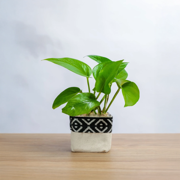 نبتة بوتس طبيعية بأوراقها المتدلّية الجذابة، مزروعة في حوض زجاجي مربع ومغلفة بشكل أنيق، لتكون هدية مثالية أو لمسة خضراء فاخرة لديكورك .
