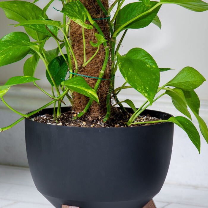 نبتة جولدن بوتس متسلقة في أصيص اسود بقاعده خشبية