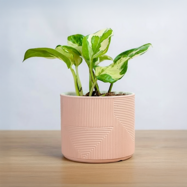 نبتة بوتس طبيعية بأوراقها المتدلّية الجذابة، مزروعة في حوض رخام وردي ومغلفة بشكل أنيق، لتكون هدية مثالية أو لمسة خضراء فاخرة لديكورك .
