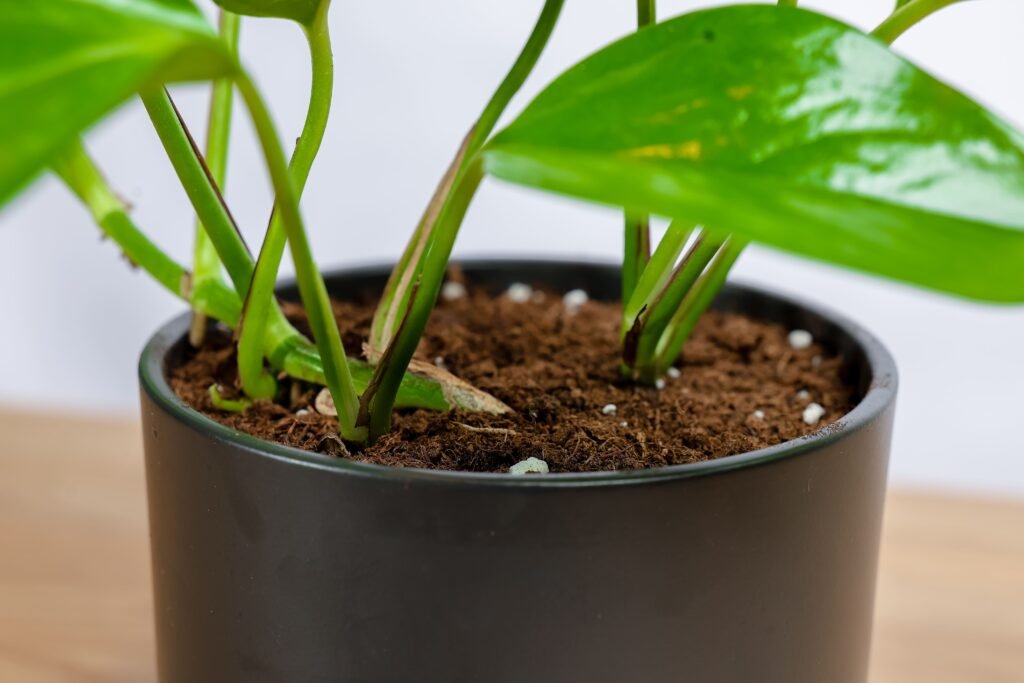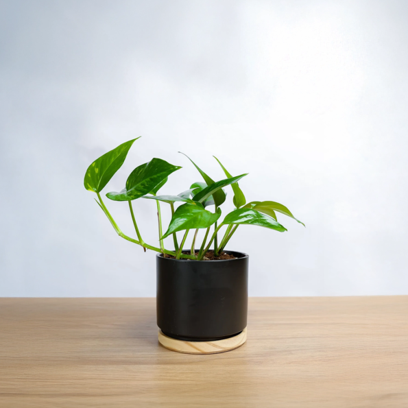 نبتة الجولدن بوتس في حوض سيراميك اسود بقاعده خشبيه