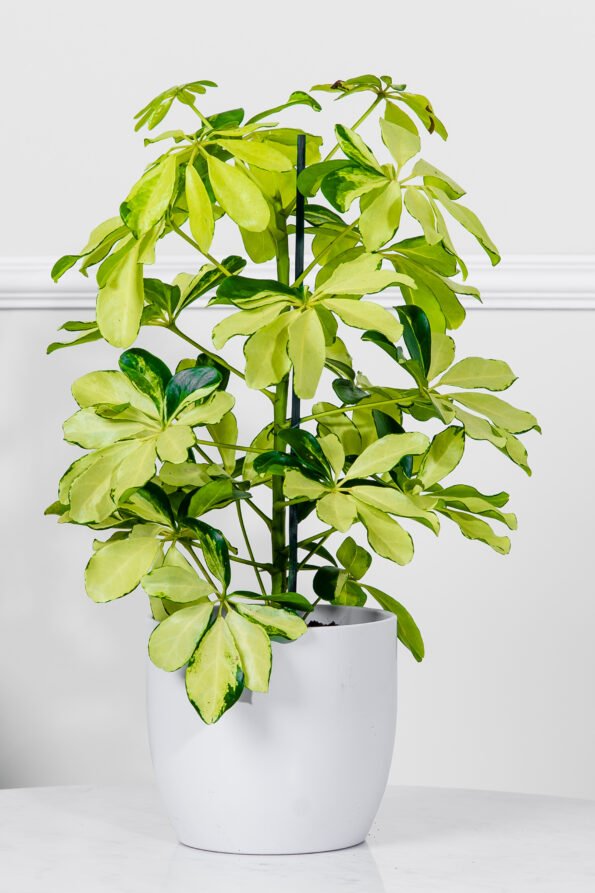 نبتة شفليرا بأوراق مبرقشة ذهبية تتميز باللون الأخضر والذهبي اللامع في أصيص سيراميك سماوي فاتح ، من النباتات السهلة في العناية والجميلة المظهر، يمكن وضعها في المنازل أو بيئات العمل المختلفة