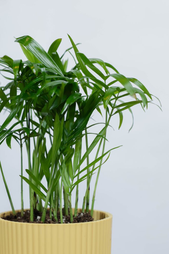 نبتة تشامادوريا في أصيص أصفر مخطط