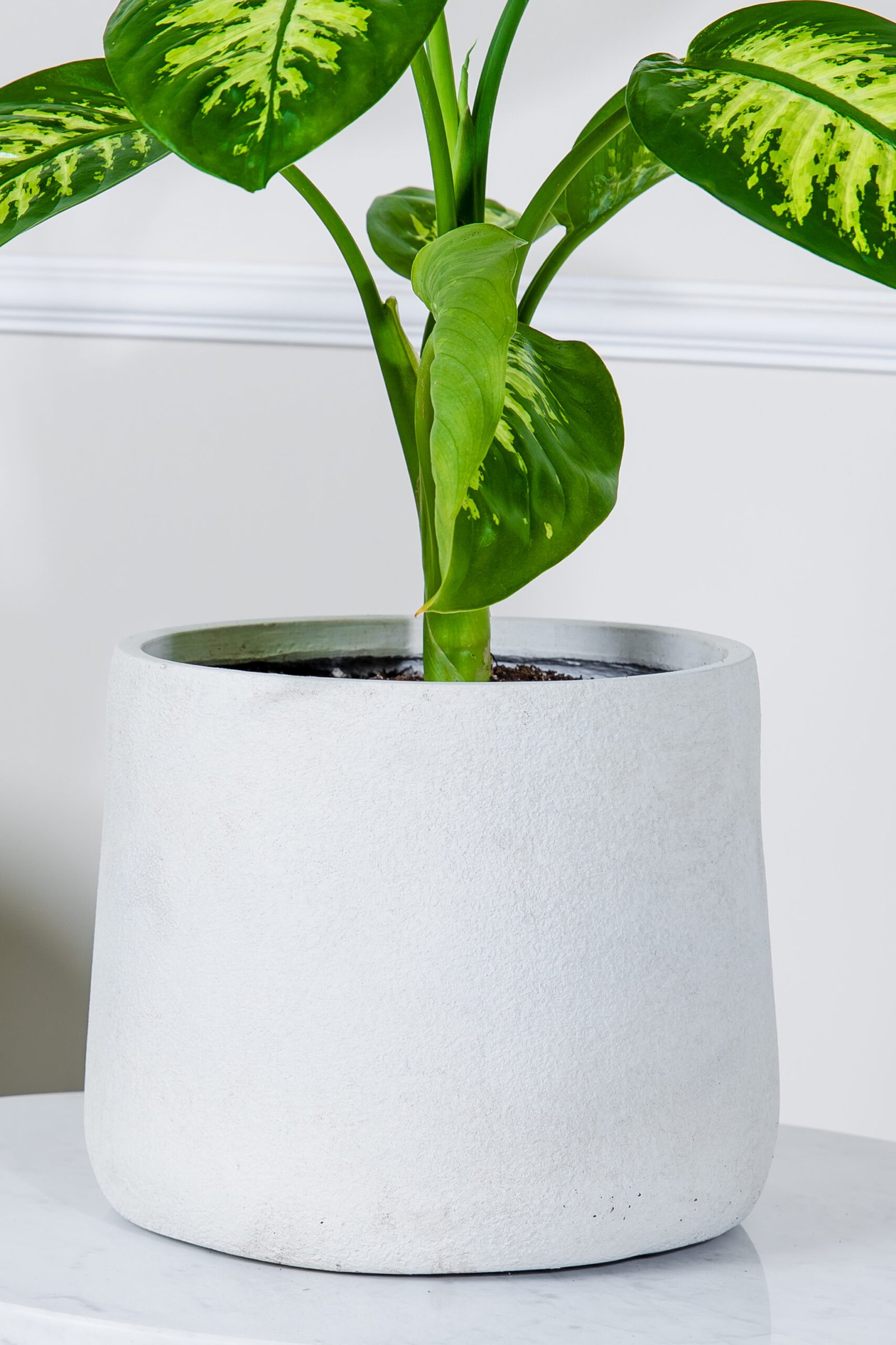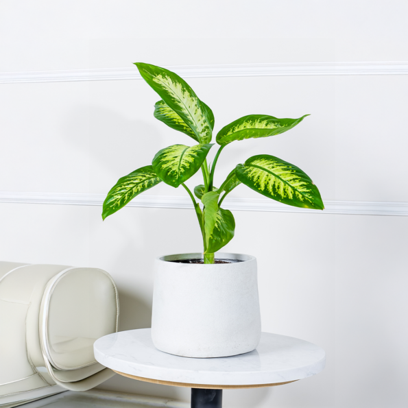 نبتة ديفنباخيا في حوض فايبر جلاس أبيض أنيق .