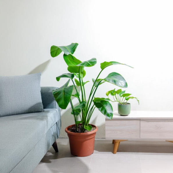 نبتة عصفور الجنة كبيرة. نبتة كبيرة ولامعة الأوراق جميلة الشكل وتحتاج للإضاءة الساطعة وضوء الشمس بشكل غير مباشر، تعتبر التشققات في أوراقها أمراً طبيعياً حيث تسمح بمرور الهواء، كما أنها من النباتات السامة لذلك ينصح بإبقائها بعيداً عن الأطفال والحيوانات الاليفه .